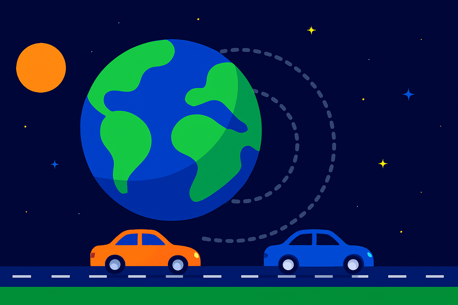 This life-giving rotation, however crucial, is not felt by us. After all, for thousands of years, humans thought everything moved around the Earth! The reason for this is that we are not only moving at a constant speed, but everything is moving at the same speed. This case is similar to when someone is driving on a highway at a constant speed parallel to someone driving the same speed.