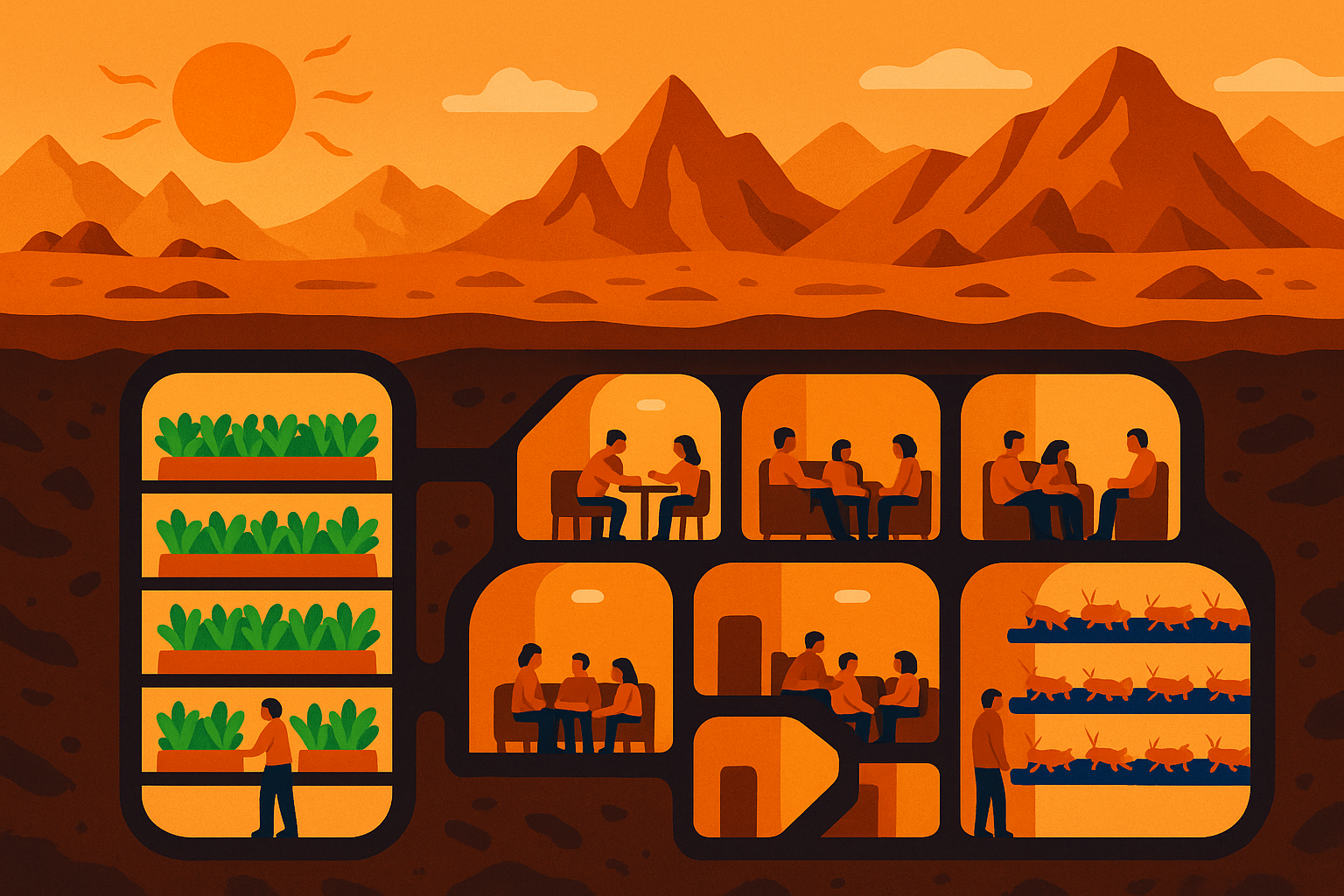 Since the surface of the Earth would be uninhabitable, one of our options would be to go down. Massive, self-sufficient cities could be constructed underground, and could be connected by hyperloops which trains that work in sealed tunnels and are propelled by high pressure air behind them, pushing them forward like a plunger in a pipe. The sunny side could be plated with solar panels which would harness the power of the sun and be diverted towards all the subterranean cities. Underground crops could be ground in huge vertical farms, where plants would be stacked up on top of each other which would be much more space-efficient than lateral farming.